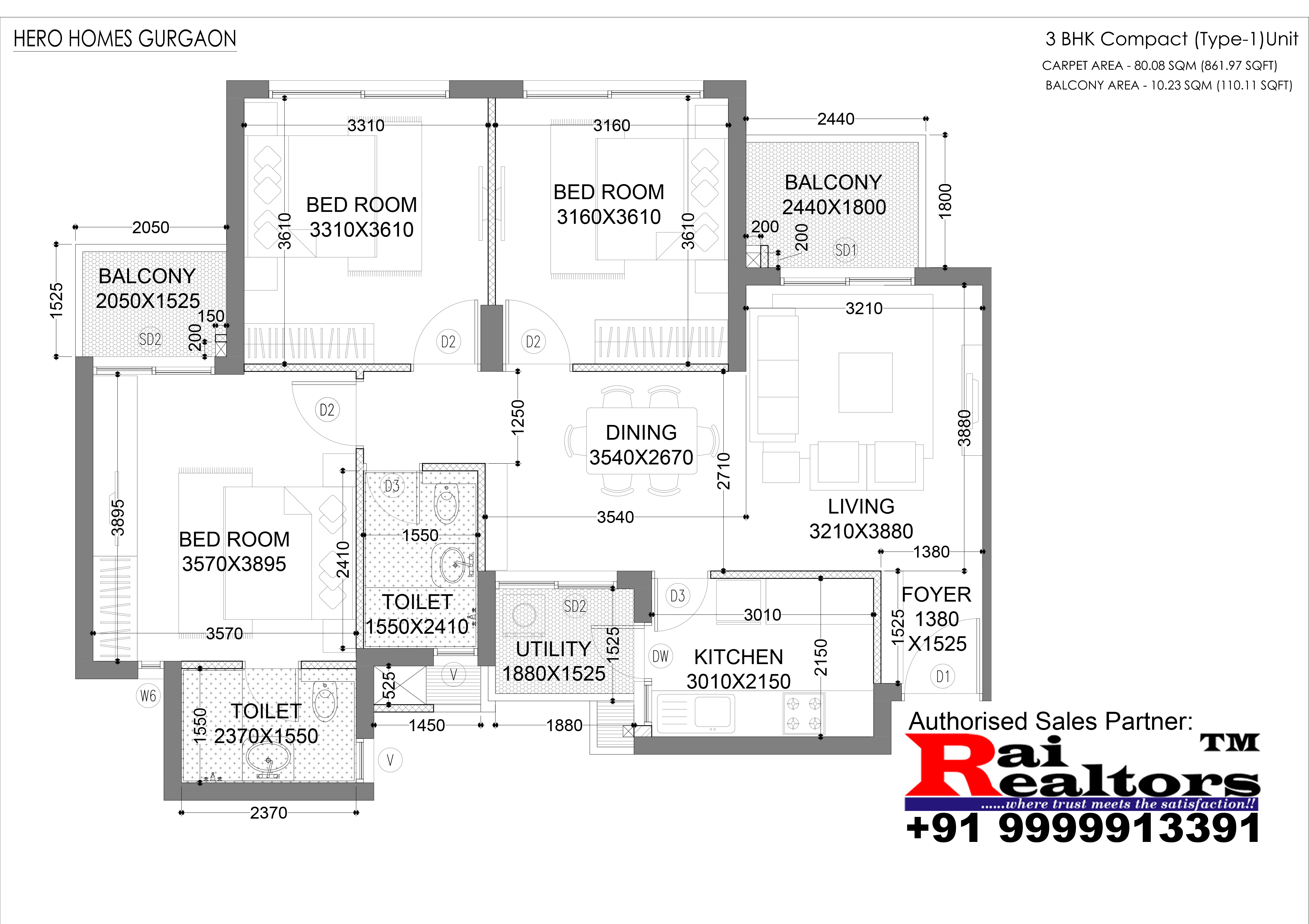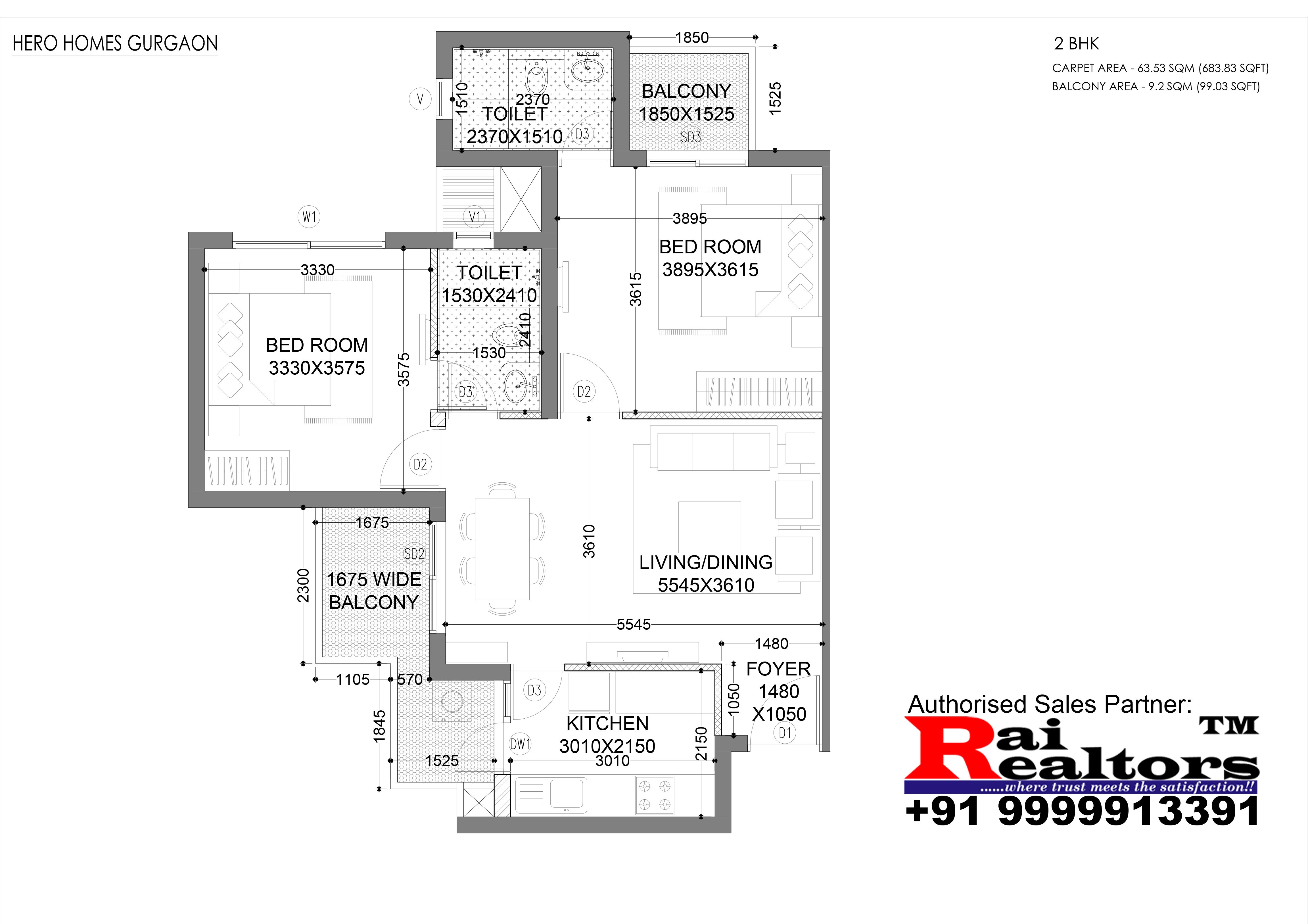 Hero Homes 2BHK, 3BHK and 3BHK Large unit layouts
